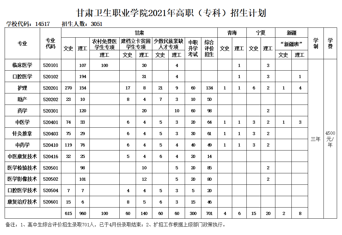 甘肅衛(wèi)生職業(yè)學(xué)院2021年招生計(jì)劃