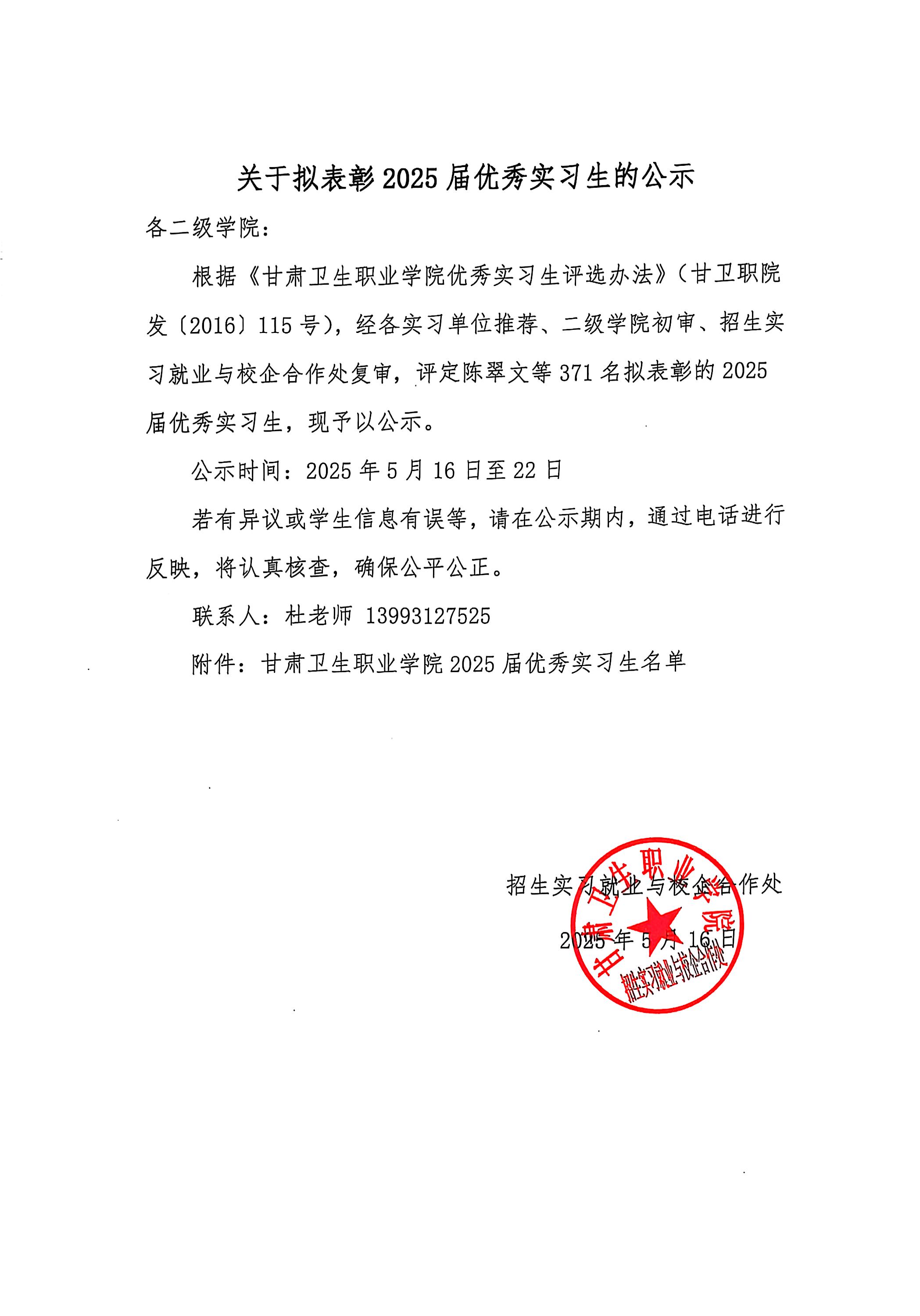 關(guān)于擬表彰2025屆優(yōu)秀實(shí)習(xí)生的公示