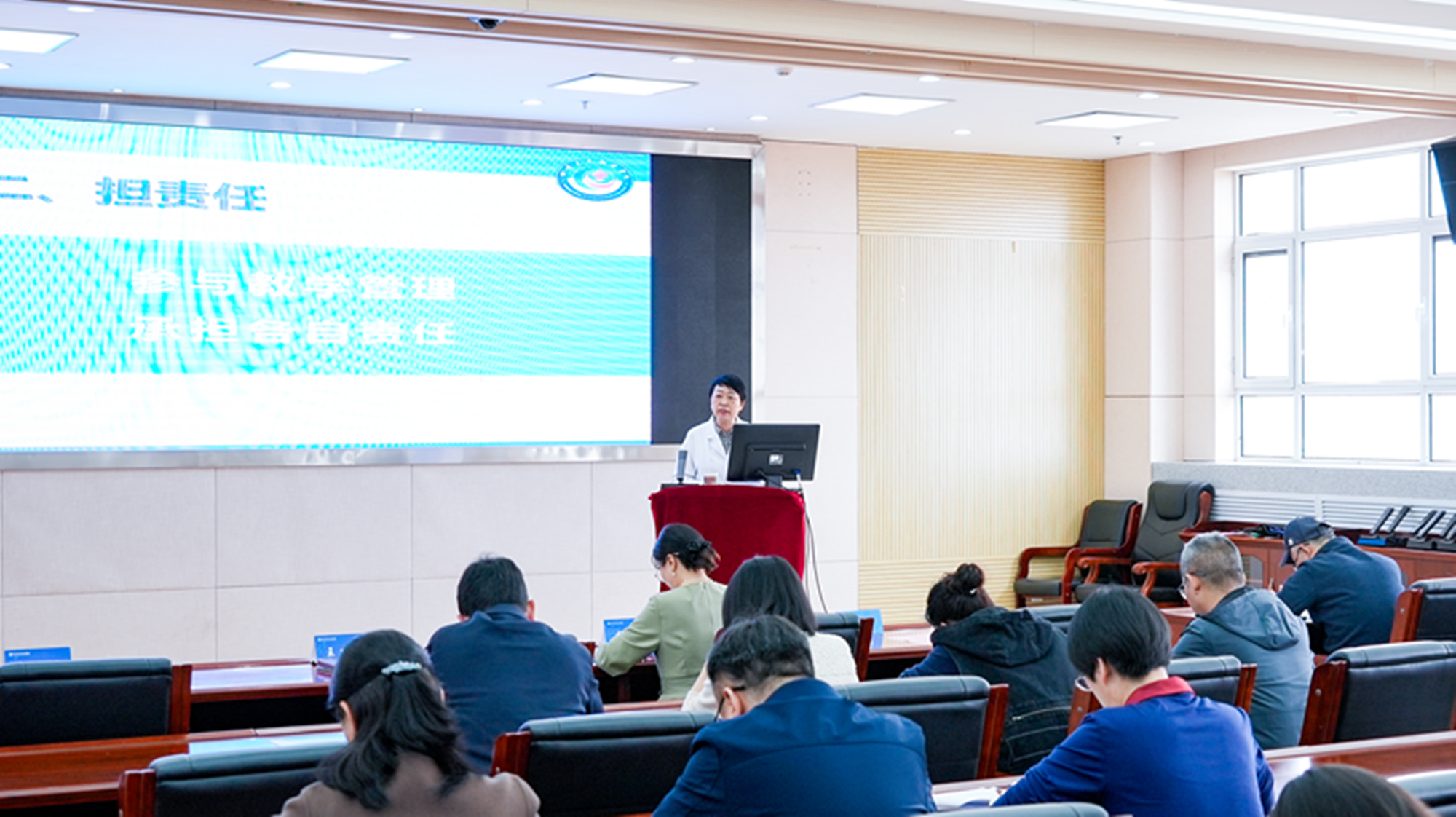 第二階段舉行教研室主任聘任儀式。副校長楊頻宣讀《關(guān)于教研室設(shè)置及主任聘任的通知》,全校共設(shè)立27個教研室,涵蓋臨床醫(yī)學(xué)、中醫(yī)、藥學(xué)等10個教學(xué)單位及跨部門聯(lián)合教研室。校領(lǐng)導(dǎo)為新任主任頒發(fā)聘書,醫(yī)學(xué)影像與智能醫(yī)療裝備教研室主任呂俊宏作為代表表態(tài),承諾“以團隊協(xié)作推動專業(yè)建設(shè),服務(wù)學(xué)校高質(zhì)量發(fā)展目標(biāo)”。