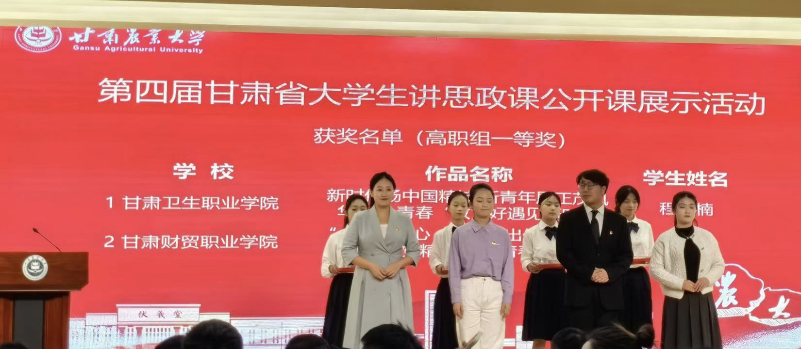 10月26日,第四屆甘肅省高校大學(xué)生講思政課公開課展示活動(dòng)現(xiàn)場(chǎng)決賽在甘肅農(nóng)業(yè)大學(xué)舉行。學(xué)校推薦的兩部作品全部獲獎(jiǎng),其中由程祎楠同學(xué)主講的《新時(shí)代揚(yáng)中國(guó)精神 新青年展正茂風(fēng)華——青春“政”好遇見新時(shí)代》榮獲高職組一等獎(jiǎng)第一名,由羅培哲、豆喜娟同學(xué)主講的《八步沙里三代人 敢在大漠繪丹青——我看家鄉(xiāng)這十年》榮獲高職組二等獎(jiǎng)第一名。